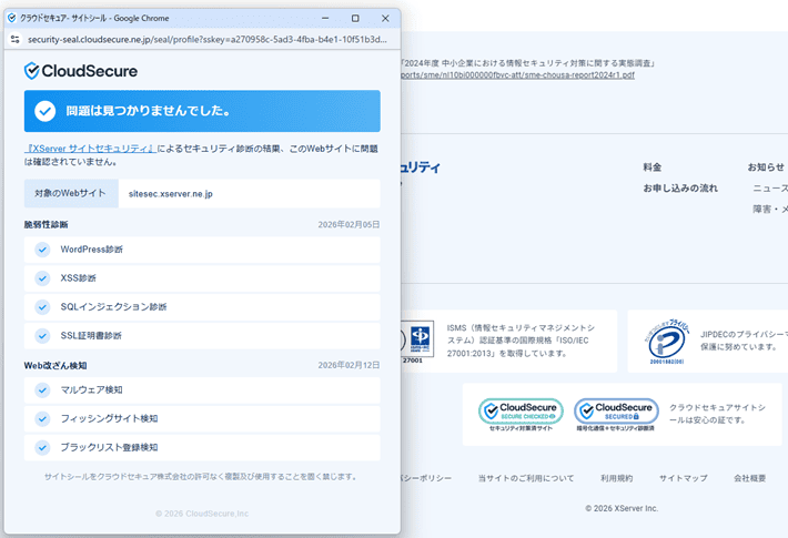 XServer サイトセキュリティの公式サイトにある「サイトシール」をクリックした様子