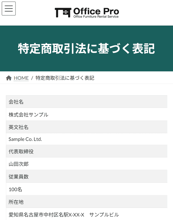 この記事では、オフィス家具のレンタルサービスを想定して「特定商取引法に基づく表記」を作成してみましたので、参考にしてください。