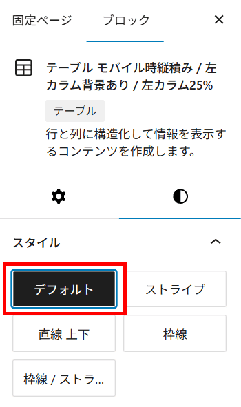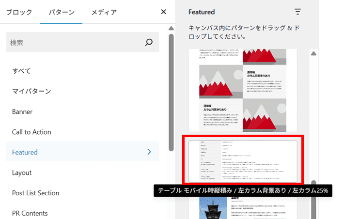 「テーブル モバイル時縦積み / 左カラム背景あり / 左カラム25%」というパターンを探して、クリックします。