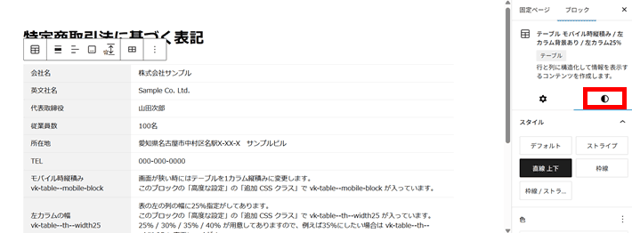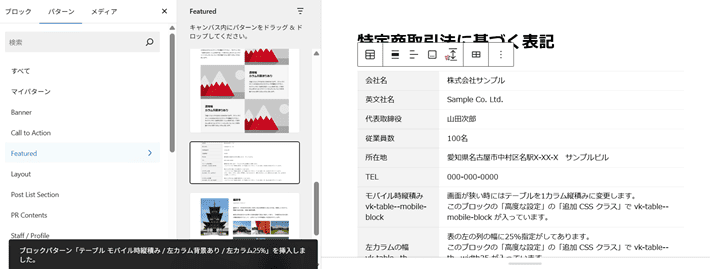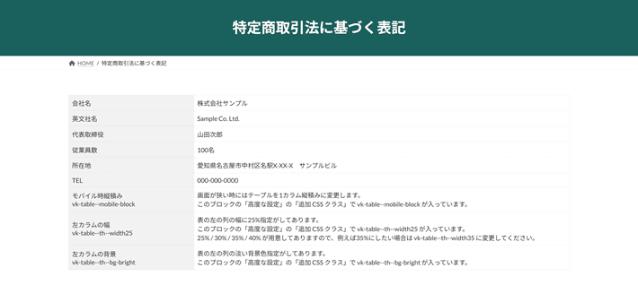 - 「特定商取引法に基づく表記」のテーブルには、ブロックパターンを使うと便利