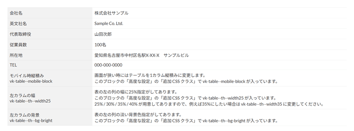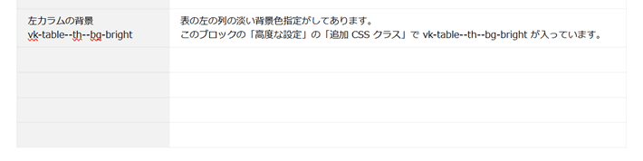 テーブルブロックを使って、左の列に薄いグレーの背景色がつくようにカスタイズされています。