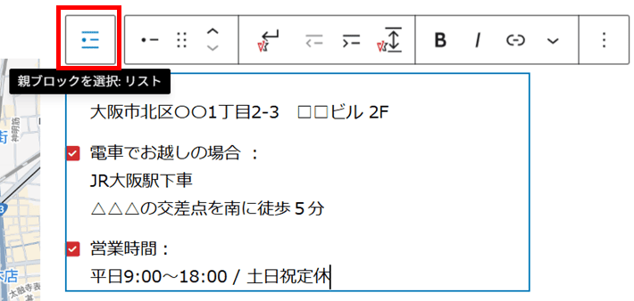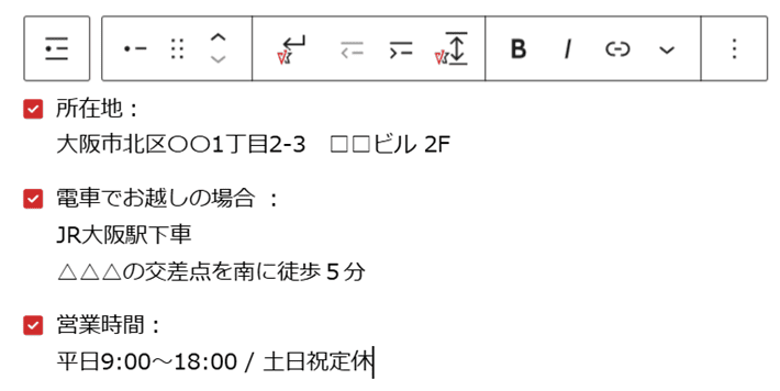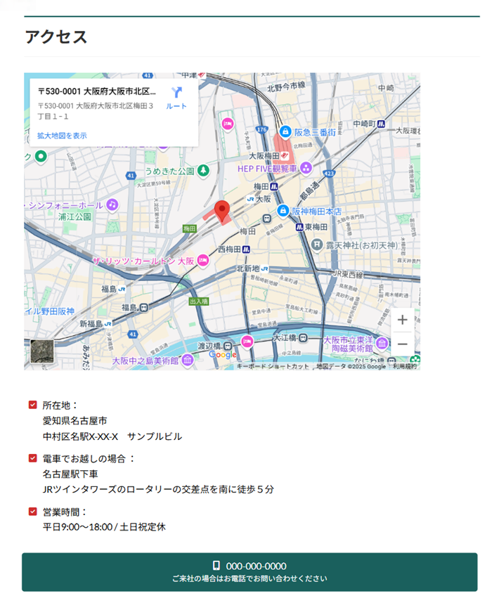 - 住所:〒000-0000 大阪市北区〇〇1丁目2-3 □□ビル 2F