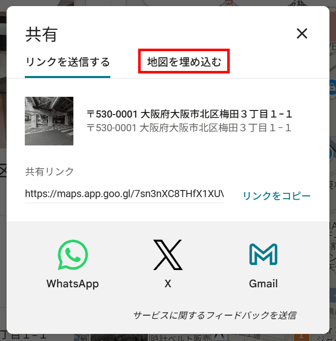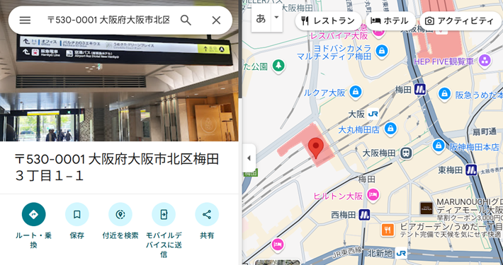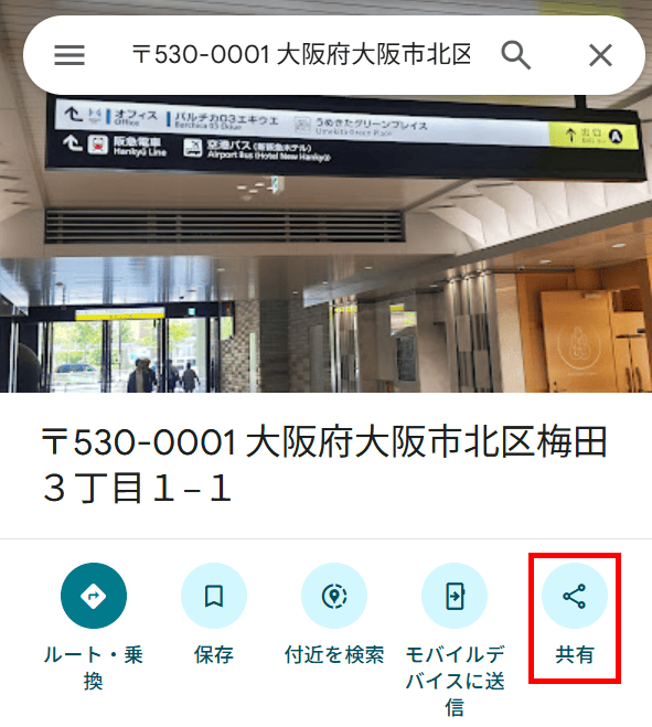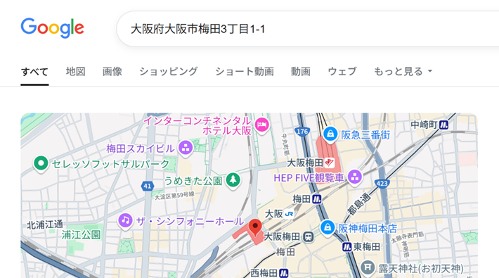 『Google』で埋め込みたい住所を検索します。ここでは、大阪駅の住所で検索してみました。