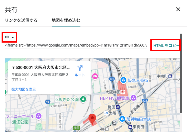 埋め込む地図のサイズ「中」のコードが表示されています。