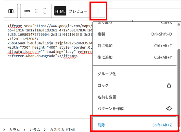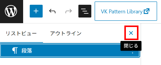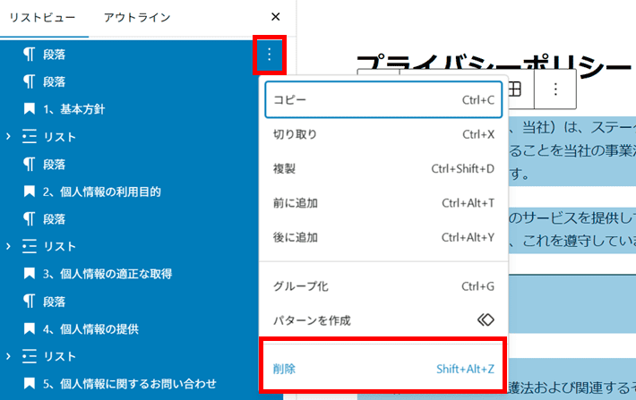 一番上の「段落」の「⋮」から「ブロックを削除」をクリックします。