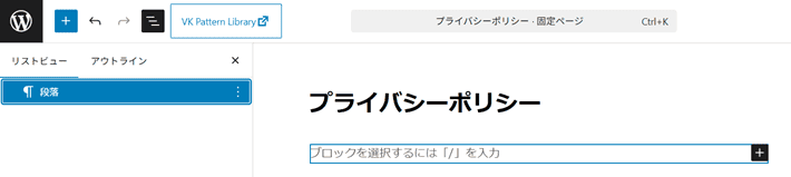 「プライバシーポリシー」ページの編集画面に戻り、「ブロックを選択するには「/」を入力」の先頭にカーソルを置き、右クリックして「貼り付け」をクリックします。