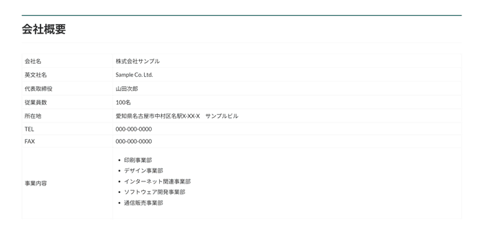 下記コンテンツを作成します。こちらは「会社案内」のページです。