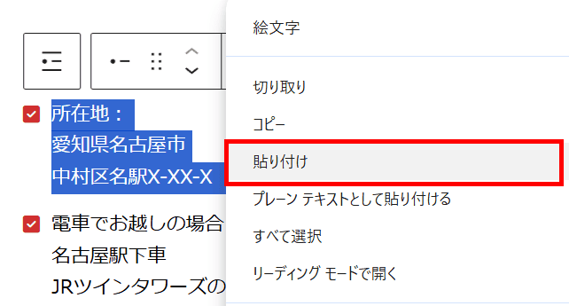 選択した箇所を右クリックして「貼り付け」をクリックします。