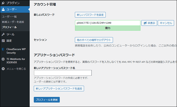 WordPressでは、「ユーザー > プロフィール」の画面で「新しいパスワード」をクリックすることで、強力なパスワードを簡単に設定できます。