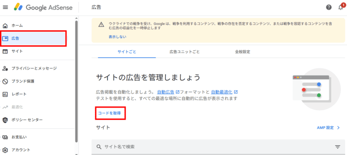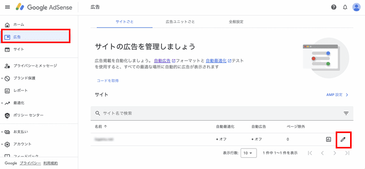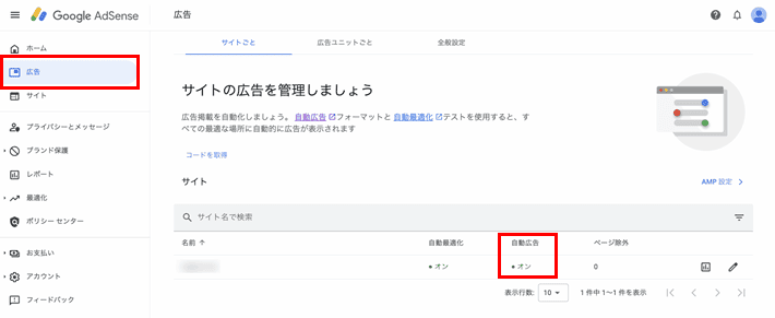 Google AdSense管理画面の「広告」の「サイトごと」では、自動広告の設定を確認できます。