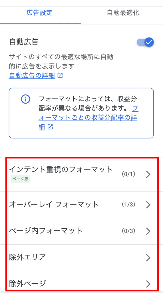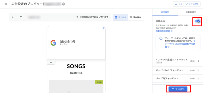 記事のフォーマット(ページ内広告、関連コンテンツ、アンカー、モバイル全面広告など)ごとに、表示したくないフォーマットをオフにできます。