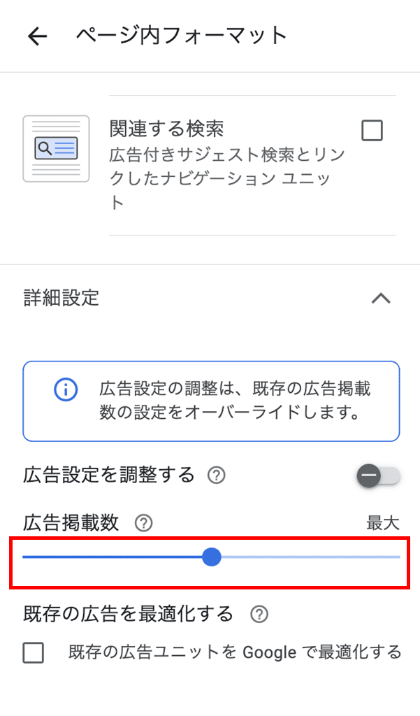 1ページの広告数が多いと感じたら、「ページ内フォーマット」の「広告掲載数」に表示される「最小⇔最大」のバーをスライドして加減できます。
