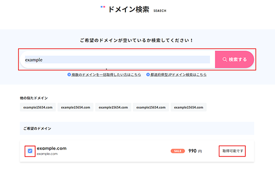 ドメインの検索方法は、次の3ステップで完了します。検索は無料で何度でもできるため、ぜひお試しください。