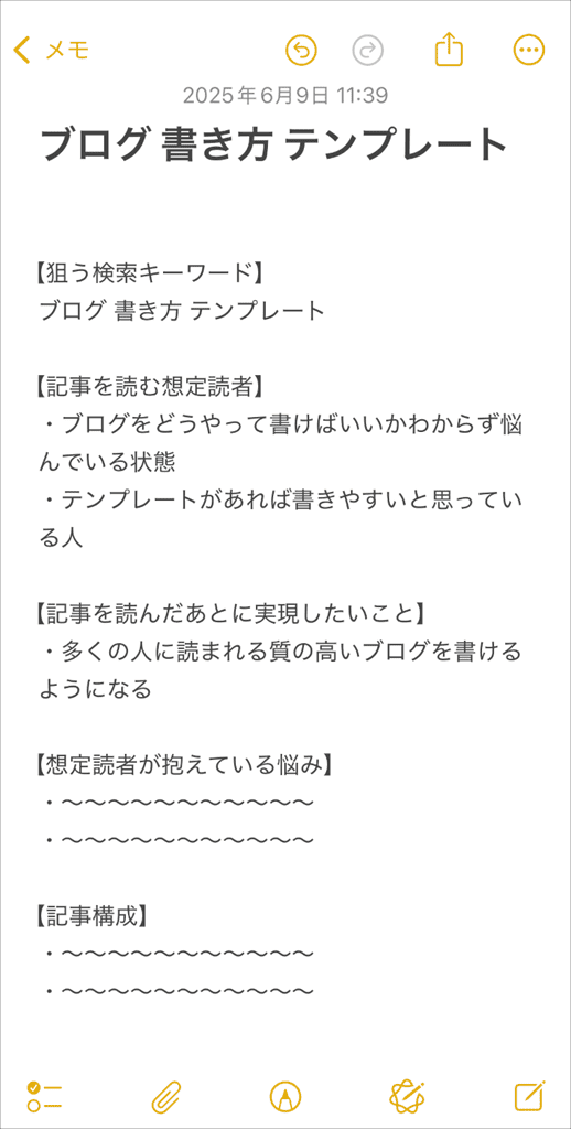 たとえば「ブログ 書き方 テンプレート」という記事を作るとすると、以下のように必要な情報を書き出すイメージです。