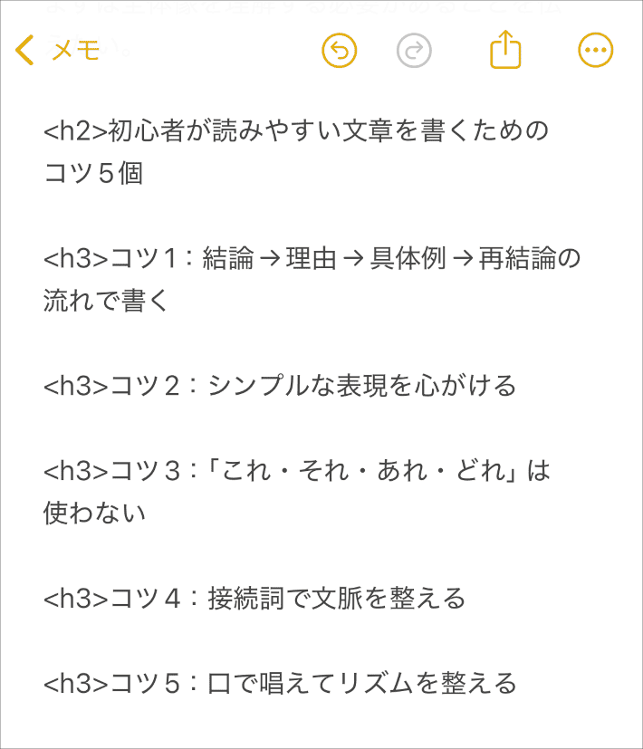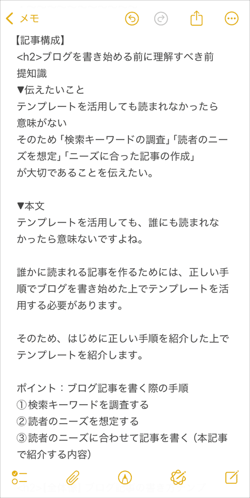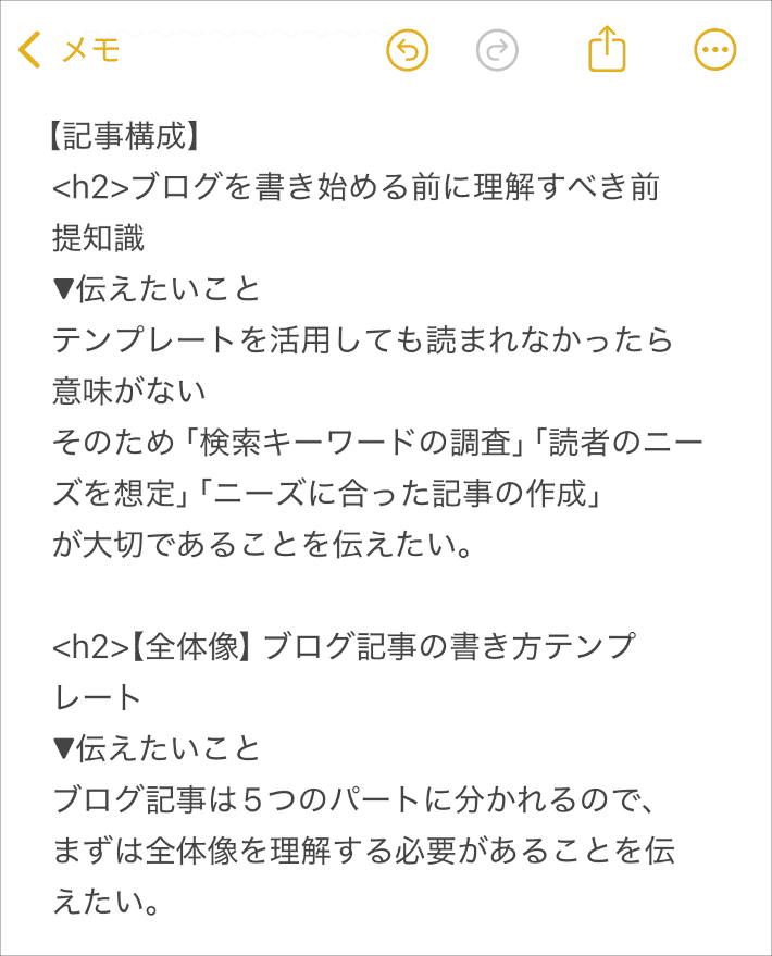 以下を参考に、記事構成のイメージを掴んでみてください。(※具体的な作り方はのちほど解説します。)