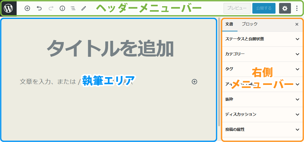 文章は「執筆エリア」に書き、個々のブロック設定や公開に関する設定は「設定サイドバー」で行います。「ヘッダーメニューバー」ではブロックの追加や下書き保存などを行います。