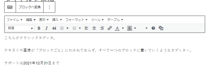 とはいえ、クラシックエディタは今後使えなくなる可能性があるため、今のうちにブロックエディタに慣れておきましょう。