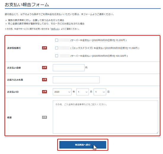 銀行振込によるお支払い内容をサポートまで連絡することができます。