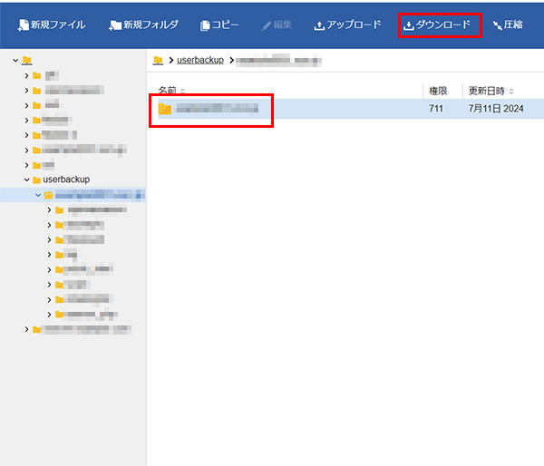 「userbackup」のフォルダを選択し、「ダウンロード」をクリックしてください。