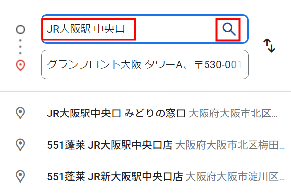 次に、ルートの入力欄に、「JR大阪駅 中央口」と入力し、検索アイコンをクリックします。