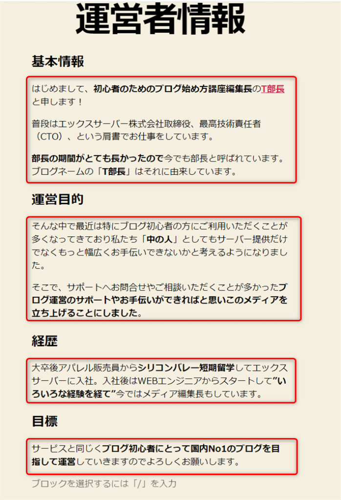 「見出し2」で「氏名などの基本情報」「ブログの運営目的」「実績や経歴」「目標」をそれぞれ入力する